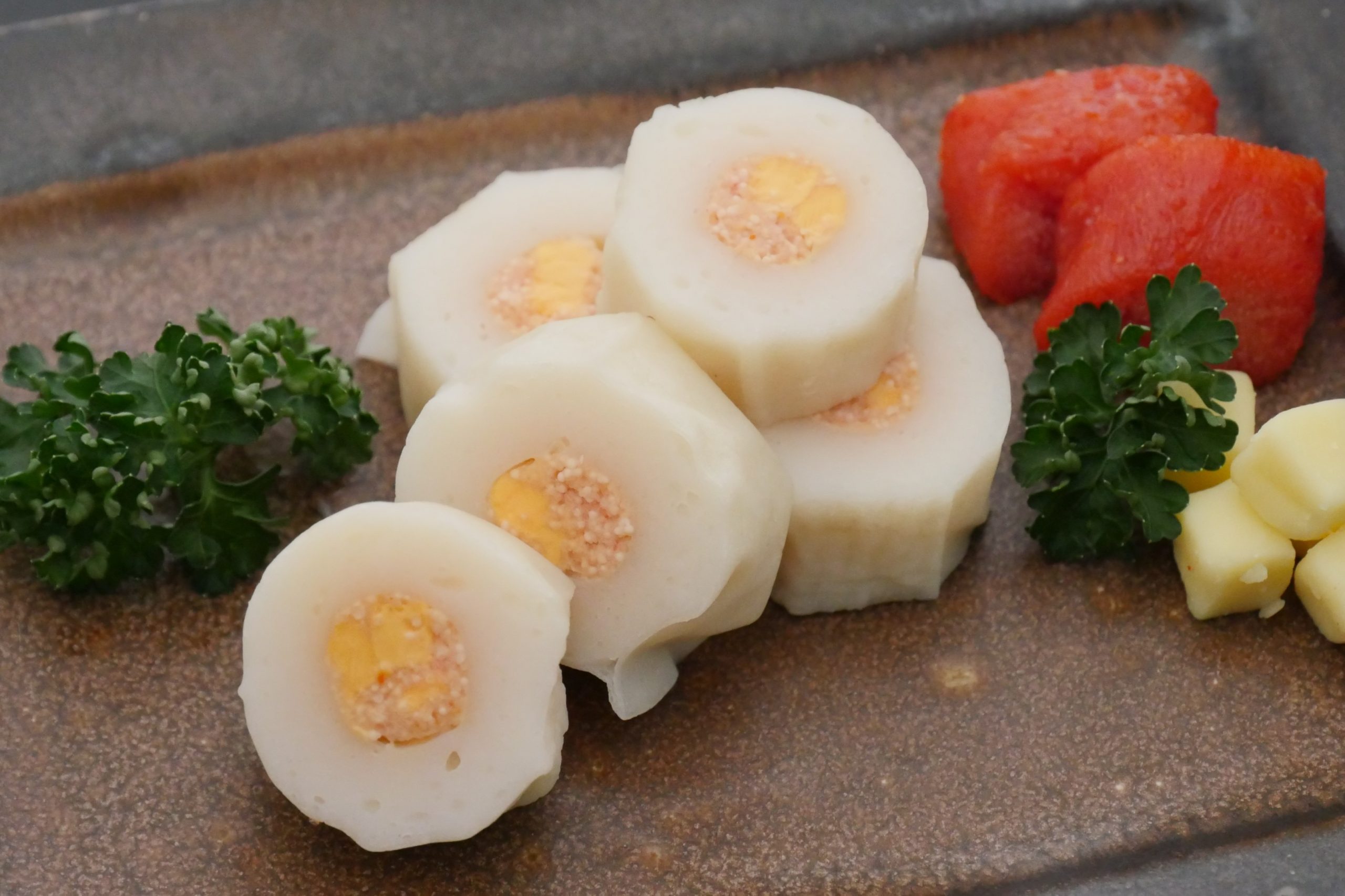 アゴだしの風味を効かせた特性ダレで仕上げた明太子を、スケソウダラのすり身と合わせてペースト状にし、まろやかなコクのあるチーズと混ぜ合わせて、弾力のあるちくわに詰めました。