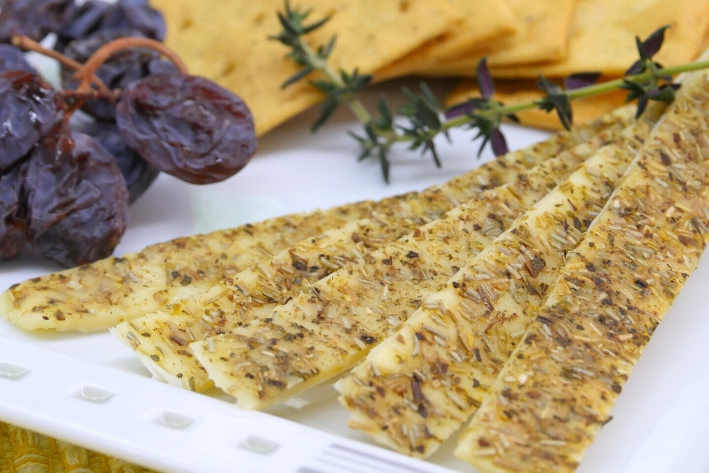 マイルドな味わいのチェダーとサムソーをブレンドしたチーズを魚肉シートにのせ、ローズマリー、バジル、マジョラム、オレガノの4種類のハーブと一緒に焼き上げています。