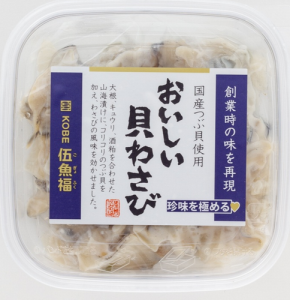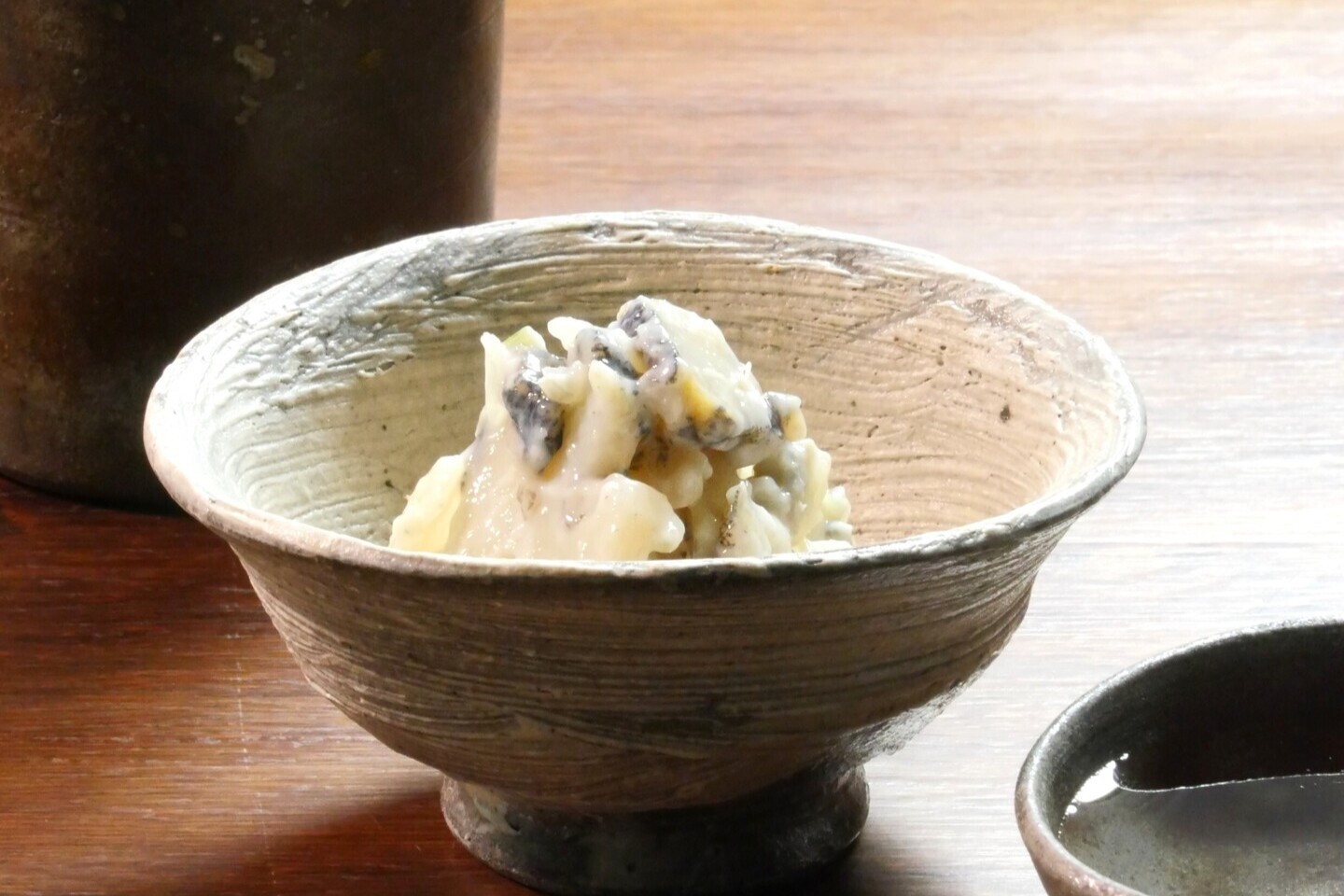 酒粕のまろやかさと、わさびのピリッとした風味、コリコリ食感のつぶ貝の組み合わせがとてもおいしいですよ。