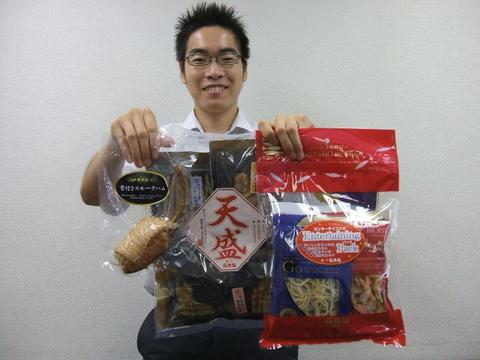 この写真は、今回準MVPに選ばれた佐藤文彦くんです。年末商品の「骨付スモークハム」、「天盛」、「エンターテイニングパック」を手にしています。