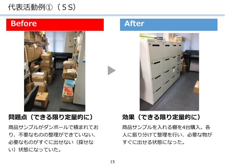 なぜ5S活動をしなければならないのか、「整理とは」、「整頓とは」、「清掃とは」、「清潔・躾とは」、「安全」という座学から始まり、各部署に持ち帰っての話し合い、実践。
