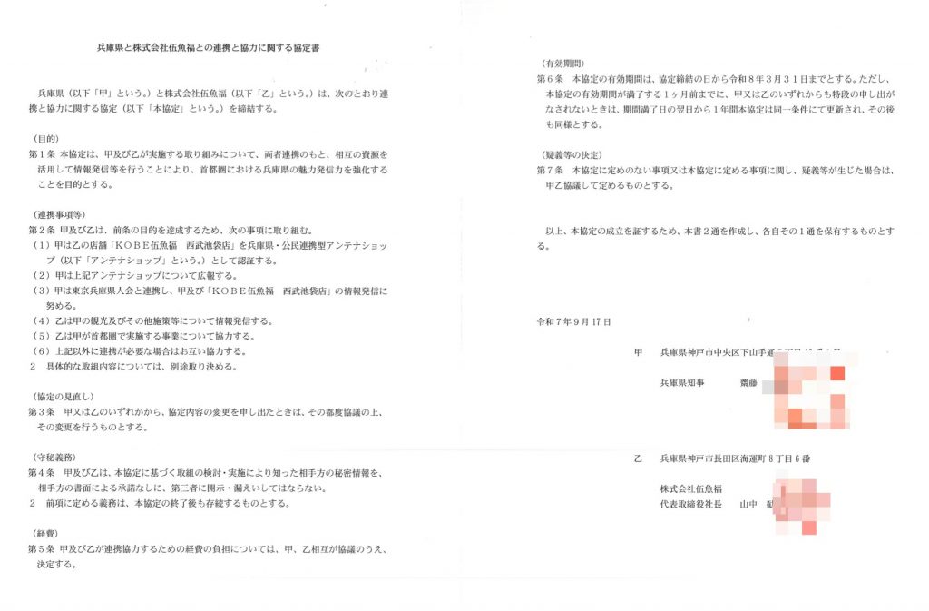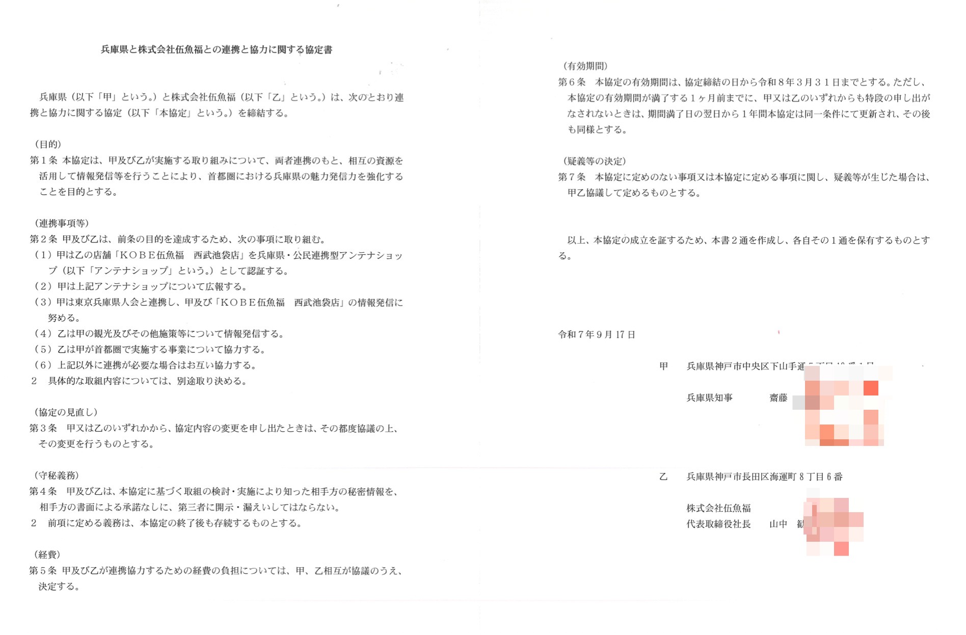 伍魚福は、「兵庫県と株式会社伍魚福との連携と協力に関する協定書」を締結いたしました。