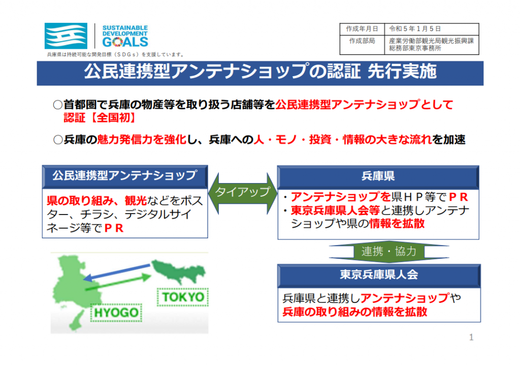これは、新しいアンテナショップの形態として、首都圏で兵庫ゆかりの商品やサービスを取り扱う店舗を兵庫県・公民連携型アンテナショップとして県が認証し、展開していくことで、首都圏における兵庫の魅力発信力を強化する、という取り組みです。