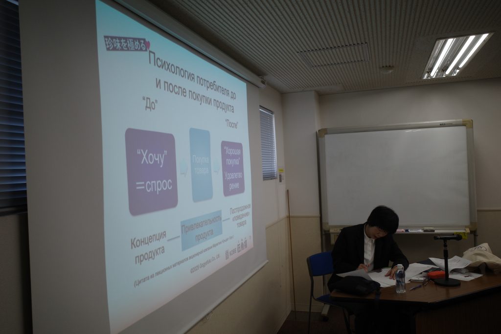 企業戦略、マーケティング、商品開発を中心に再構成したスライドをロシア語に翻訳いただいたものを投影。