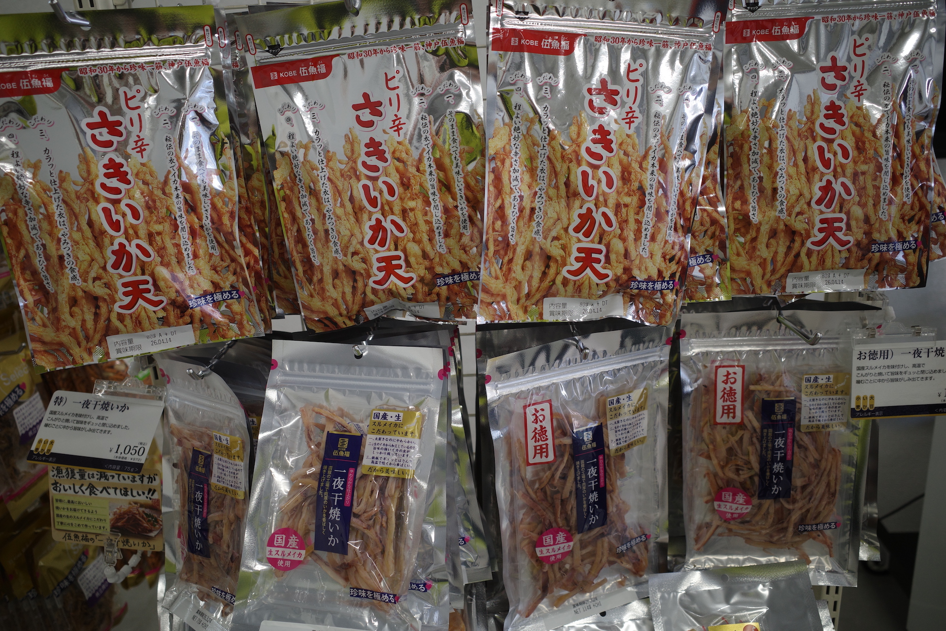 定番の「ピリ辛さきいか天」や「一夜干焼いか」もリピーターの方多数。