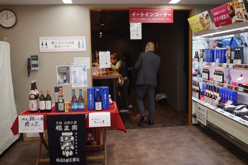 伍魚福の研究所奥にイートインコーナーを開設し、日本酒2種類とおつまみを提供。