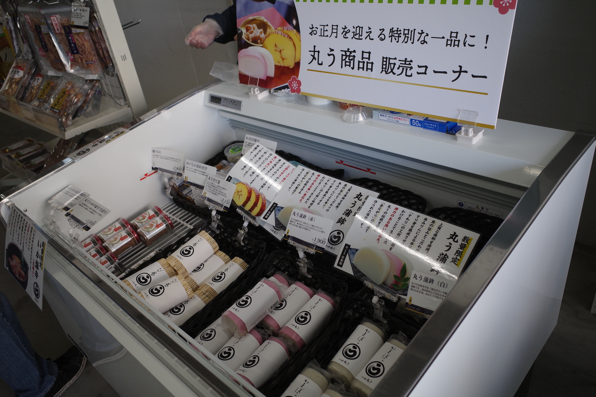 お正月前ですので「丸う」のかまぼこや伊達巻、いかの塩辛も販売。