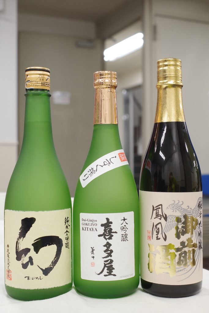 JR西日本商事さんからいただいた、「純米大吟醸幻」(広島県竹原市、中尾醸造株式会社)、「大吟醸喜多屋」(福岡県八女市株式会社喜多屋)、「純米大吟醸御前酒鳳凰」(岡山県真庭市、株式会社辻本店)。