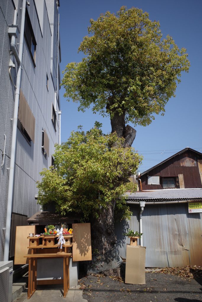 神戸市長田区海運町、伍魚福の創業の地である旧工場の祠の隣に大きな楠があります。