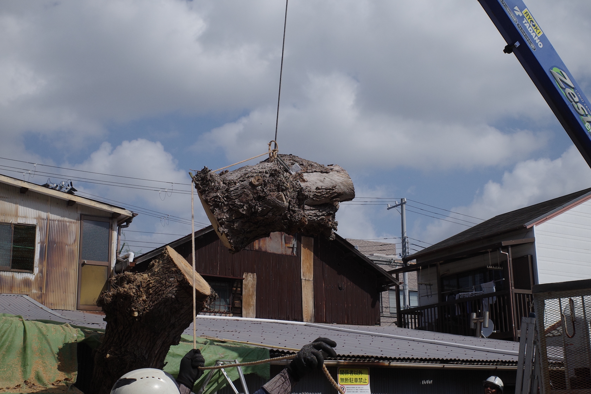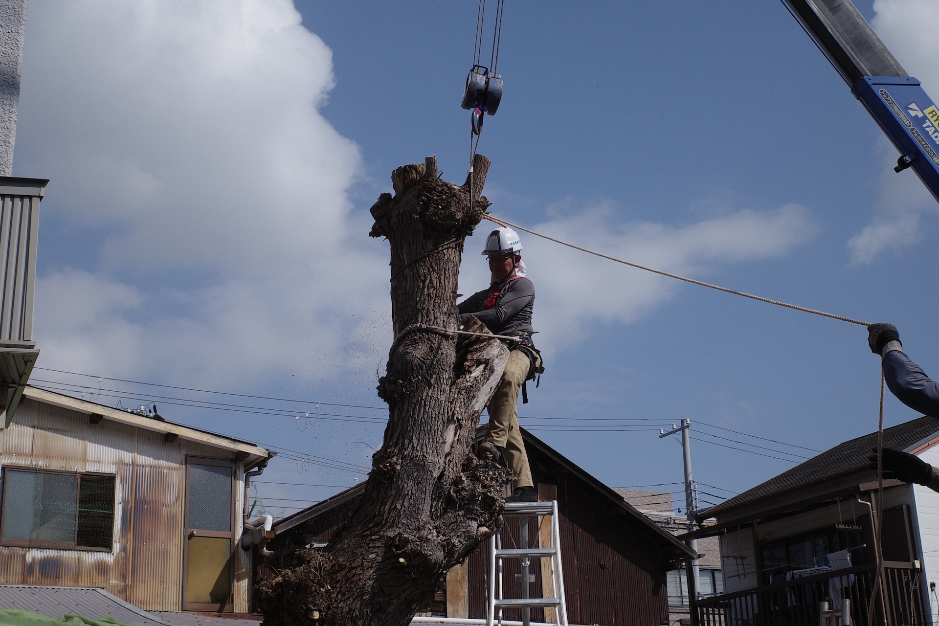 チェーンソーの入れ方やワイヤーの掛け方にもノウハウがあり、プロの仕事に感服させれられました。