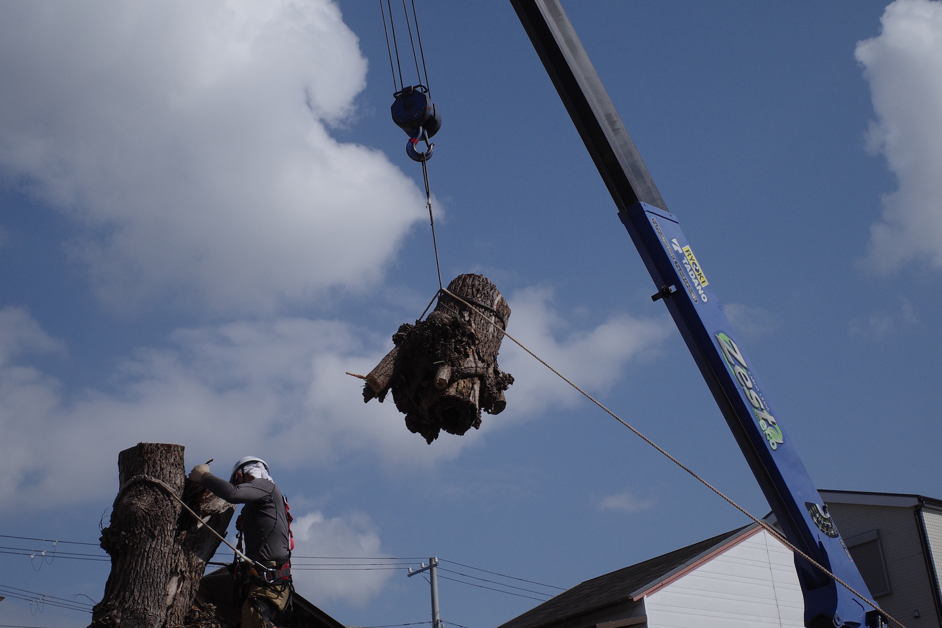 クレーンで持ち上げた際に、どちらに切った幹が振れるのかを予測してワイヤーをかけ、人との接触がないように別のロープで引っ張ります。