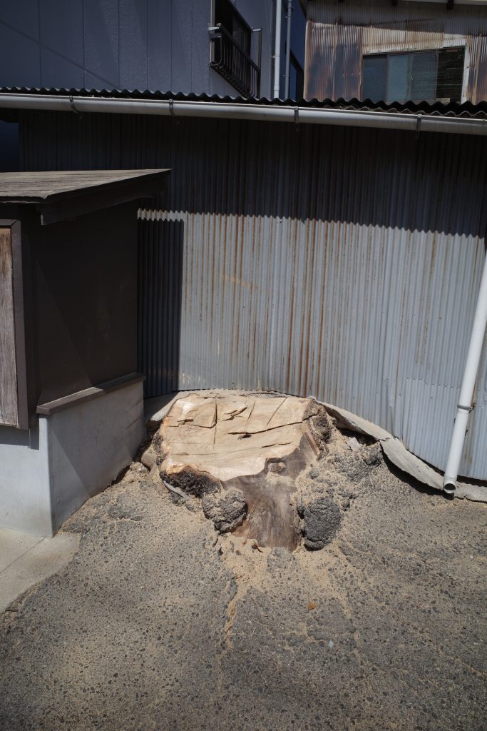 伍魚福の創業まもなくと思われますが、祖母(現名誉会長の母)が植えた楠が大きく成長し、アスファルトの地面を割ったり、隣の祠を歪めたりしていました。