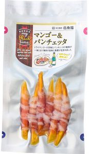 甘みの強いドライマンゴーをスティック状にカットし、塩味のあるパンチェッタで巻きました。色鮮やかな見た目です。